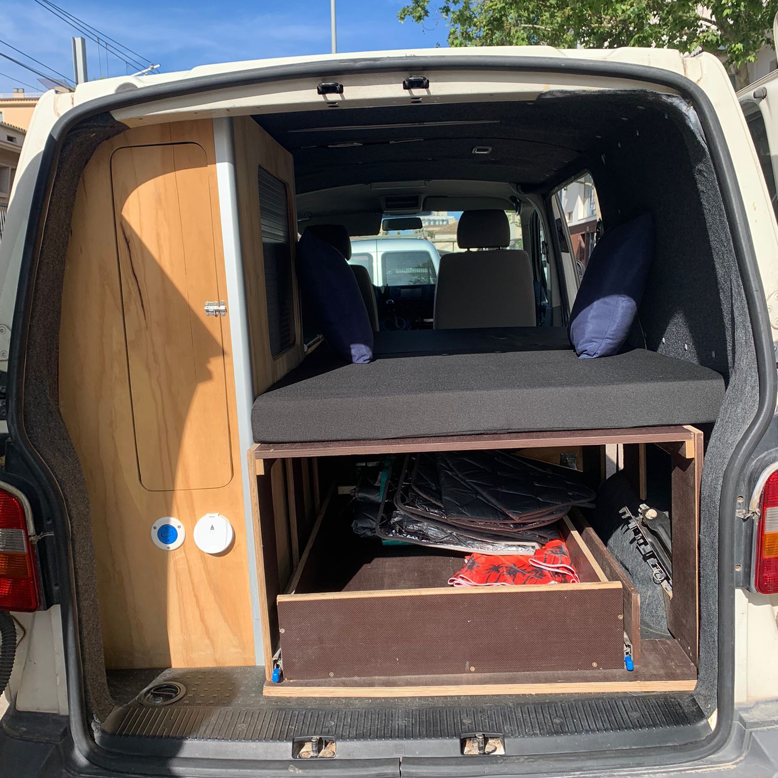 When you open the door of your MallorquetaVan, you’ll discover a cozy space with a double sofa bed, panoramic windows that allow you to enjoy the spectacular views, and a removable central table for meals and activities. With a built-in second battery that includes 12V and USB outlets, a kitchen with gas burners and a refrigerator, as well as an outdoor shower to cool off under the Mallorcan sun, our vans are designed to provide you with comfort in every corner of the island.